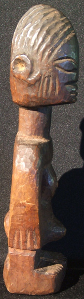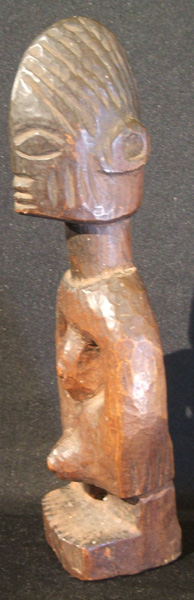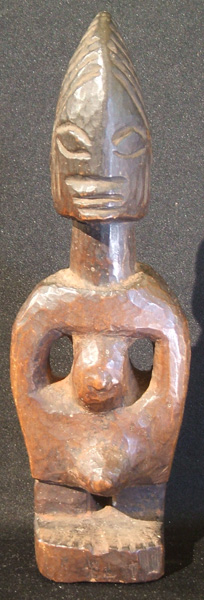 Twins are considered to be powerful spirits, so upon the death of one or both twins, the ibeji, a small wood figure, is carved to represent the deceased child. The ibeji is treated just as if the child were still alive. It is bathed. clothed, fed and generally looked after by the mother to assure that only good fortune is brought to the family. Ibejis are not carved to look like children but instead they appear as either male or female adults. |