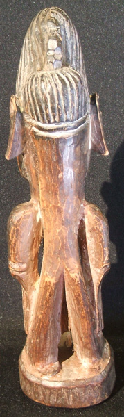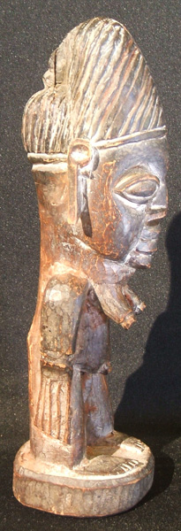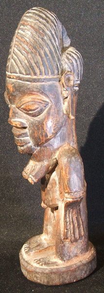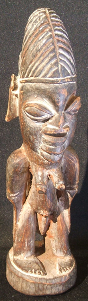 Twins are considered to be powerful spirits, so upon the death of one or both twins, the ibeji, a small wood figure, is carved to represent the deceased child. The ibeji is treated just as if the child were still alive. It is bathed. clothed, fed and generally looked after by the mother to assure that only good fortune is brought to the family. Ibejis are not carved to look like children but instead they appear as either male or female adults. |